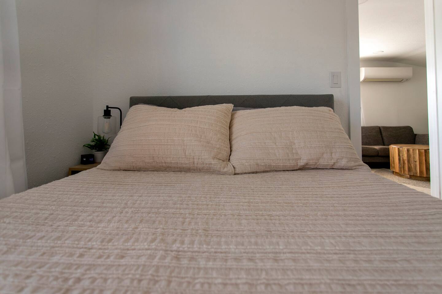 The pull-out couch is a good fit for two children. The house has a mini-split HVAC system, providing both heat and A/C. Also there are electric wall heaters in each room to take the edge off of those cold winter nights. Please note, this house is right on the main road, so there is road noise. White noisemakers are provided to help cover the noise.